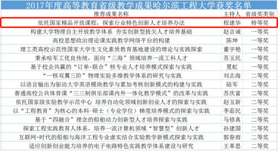 近日,2017年度高等教育省级教学成果奖获奖项目揭晓,我校共获得特等奖1项,一等奖5项,二等奖9项的好成绩。其中我团队程建华老师主持的“依托国家精品开放课程,探索行业特色创新人才培养方法”获得特等奖。充分体现了团队在加强教学质量内涵建设、提高人才培养水平方面的整体实力。